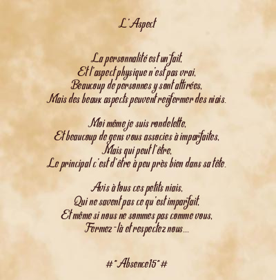 #*Absence15*# a publié sur le site 12 écrits. #*Absence15*# est membre du site depuis l'année 2006.Lire le profil du poète #*Absence15*#Syllabation De L'Écrit