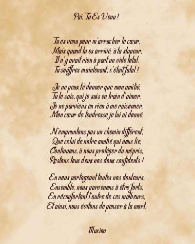 Illusion a publié sur le site 953 écrits. Illusion est membre du site depuis l'année 1994.Lire le profil du poète IllusionSyllabation De L'Écrit