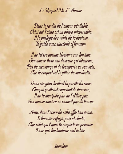 Il est probable que le véritable amour exige le respect mutuel mais aussi l’admiration pour la personnalité et les valeurs immatérielles de l’être aimé. Des attributs difficiles à trouver chez une seule personne qui, dans sa nature humaine, est imparfaite et faillible. C’est peut-être pour cela que, parmi tous les amours, le plus inconditionnel est l’amour maternel, qui n’a vraiment pas besoin des vertus d’un enfant pour l’aimer dans toutes les circonstances. Il est possible que le mythe de l’amour parfait n’existe que dans la grandeur de celui qui le ressent, cependant certains attributs essentiels sont nécessaires pour générer la chimie affective et émotionnelle qui unit durablement deux êtres humains. Un beau poème, Inamtom!