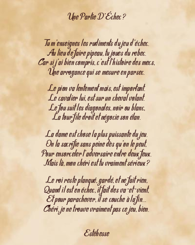 Agréable à découvrir cette partie d’échec poétique. Cela rend bien sous votre fine plume qui en dégage de belles images. J ’aime et au plaisir de nouveaux échanges.