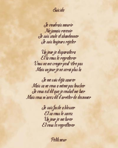 Alors la NON, tu n’as pas à penser comme ça. . . , même si la vie est faite de douleurs, il y a aussi d’intense moment de bonheur à découvrir, et si tu ne les as pas vécu, c’est qu’il vont bientôt t’arriver, alors garde toujours confiance en toi, ne baisse pas les bras. . . , si tu ne le fait pas pour toi, fait le pour ceux qui t’aime, ta famille et tes amies. . . , bel écrit,
