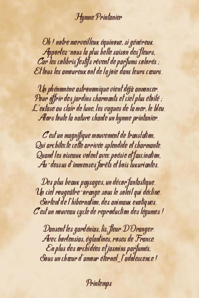 C’est un poème magnifique qui célèbre l’arrivée du printemps avec une profusion de couleurs et de parfums. La nature se réveille, les oiseaux chantent, et tout semble être rempli de vie et de beauté. Votre poème décrit avec passion ce moment magique où la saison change et où la nature se transforme en un véritable paradis. C’est une célébration de la vie et de la renaissance de la nature.