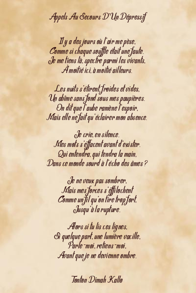 Bonjour, je ne sais pas si ce poème vous reflète mais ds ce cas, faites vous aider par le médecin, le psychologue... Beaucoup de personnes sont dans ce cas et il suffit de dépasser le pic de détresse le plus haut pour ensuite aller mieux ! Ne désespérez pas et chercher les petits bonheurs du quotidien qui sont à votre portée ! Rien n est perdu !